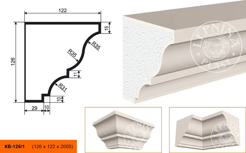 Карниз КВ-126/1 производителя LEPNINAPLAST изготовленный из полистирола высокой плотности, который покрыт эластичной шпатлевкой PS Technoplaster, покрытие абсолютно устойчиво к атмосферным и механическим повреждениям. Карниз является декоративным элементом, используемым монтажа под кровлю или межэтажным разделением. Он обладает рядом преимуществ, таких как легкий вес, прочность, устойчивость к влаге. Их установка также относительно проста. Карниз может использоваться как в новом строительстве, так и при реставрации старых зданий для придания им нового внешнего вида. Перед покраской не требуется обязательная покрытие грунтовкой, для склеивания изделий между собой рекомендуется использовать клея: CERESIT CT 84, PENOSIL FIXGo, TYTAN STYRO 753.