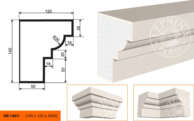 Карниз КВ-140/1 производителя LEPNINAPLAST изготовленный из полистирола высокой плотности, который покрыт эластичной шпатлевкой PS Technoplaster, покрытие абсолютно устойчиво к атмосферным и механическим повреждениям. Карниз является декоративным элементом, используемым монтажа под кровлю или межэтажным разделением. Он обладает рядом преимуществ, таких как легкий вес, прочность, устойчивость к влаге. Их установка также относительно проста. Карниз может использоваться как в новом строительстве, так и при реставрации старых зданий для придания им нового внешнего вида. Перед покраской не требуется обязательная покрытие грунтовкой, для склеивания изделий между собой рекомендуется использовать клея: CERESIT CT 84, PENOSIL FIXGo, TYTAN STYRO 753.