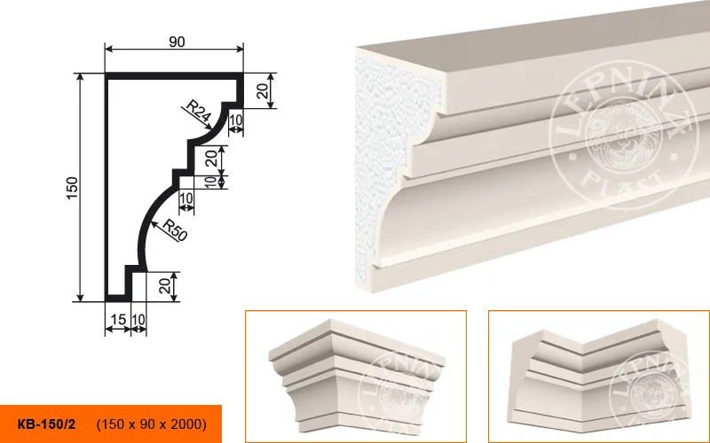 Карниз КВ-150/2 производителя LEPNINAPLAST изготовленный из полистирола высокой плотности, который покрыт эластичной шпатлевкой PS Technoplaster, покрытие абсолютно устойчиво к атмосферным и механическим повреждениям. Карниз является декоративным элементом, используемым монтажа под кровлю или межэтажным разделением. Он обладает рядом преимуществ, таких как легкий вес, прочность, устойчивость к влаге. Их установка также относительно проста. Карниз может использоваться как в новом строительстве, так и при реставрации старых зданий для придания им нового внешнего вида. Перед покраской не требуется обязательная покрытие грунтовкой, для склеивания изделий между собой рекомендуется использовать клея: CERESIT CT 84, PENOSIL FIXGo, TYTAN STYRO 753.