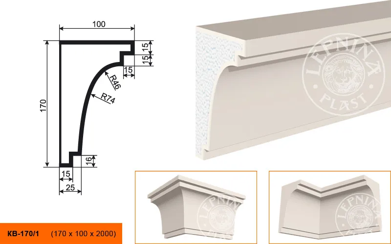 Карниз КВ-170/1 производителя LEPNINAPLAST изготовленный из полистирола высокой плотности, который покрыт эластичной шпатлевкой PS Technoplaster, покрытие абсолютно устойчиво к атмосферным и механическим повреждениям. Карниз является декоративным элементом, используемым монтажа под кровлю или межэтажным разделением. Он обладает рядом преимуществ, таких как легкий вес, прочность, устойчивость к влаге. Их установка также относительно проста. Карниз может использоваться как в новом строительстве, так и при реставрации старых зданий для придания им нового внешнего вида. Перед покраской не требуется обязательная покрытие грунтовкой, для склеивания изделий между собой рекомендуется использовать клея: CERESIT CT 84, PENOSIL FIXGo, TYTAN STYRO 753.