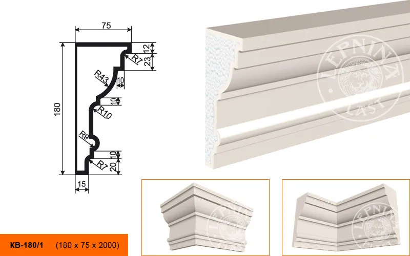 Карниз КВ-180/1 производителя LEPNINAPLAST изготовленный из полистирола высокой плотности, который покрыт эластичной шпатлевкой PS Technoplaster, покрытие абсолютно устойчиво к атмосферным и механическим повреждениям. Карниз является декоративным элементом, используемым монтажа под кровлю или межэтажным разделением. Он обладает рядом преимуществ, таких как легкий вес, прочность, устойчивость к влаге. Их установка также относительно проста. Карниз может использоваться как в новом строительстве, так и при реставрации старых зданий для придания им нового внешнего вида. Перед покраской не требуется обязательная покрытие грунтовкой, для склеивания изделий между собой рекомендуется использовать клея: CERESIT CT 84, PENOSIL FIXGo, TYTAN STYRO 753.