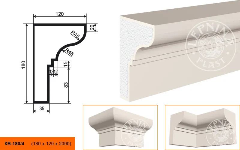 Карниз КВ-180/4 производителя LEPNINAPLAST изготовленный из полистирола высокой плотности, который покрыт эластичной шпатлевкой PS Technoplaster, покрытие абсолютно устойчиво к атмосферным и механическим повреждениям. Карниз является декоративным элементом, используемым монтажа под кровлю или межэтажным разделением. Он обладает рядом преимуществ, таких как легкий вес, прочность, устойчивость к влаге. Их установка также относительно проста. Карниз может использоваться как в новом строительстве, так и при реставрации старых зданий для придания им нового внешнего вида. Перед покраской не требуется обязательная покрытие грунтовкой, для склеивания изделий между собой рекомендуется использовать клея: CERESIT CT 84, PENOSIL FIXGo, TYTAN STYRO 753.