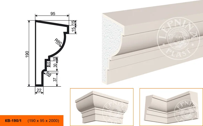 Карниз КВ-190/1 производителя LEPNINAPLAST изготовленный из полистирола высокой плотности, который покрыт эластичной шпатлевкой PS Technoplaster, покрытие абсолютно устойчиво к атмосферным и механическим повреждениям. Карниз является декоративным элементом, используемым монтажа под кровлю или межэтажным разделением. Он обладает рядом преимуществ, таких как легкий вес, прочность, устойчивость к влаге. Их установка также относительно проста. Карниз может использоваться как в новом строительстве, так и при реставрации старых зданий для придания им нового внешнего вида. Перед покраской не требуется обязательная покрытие грунтовкой, для склеивания изделий между собой рекомендуется использовать клея: CERESIT CT 84, PENOSIL FIXGo, TYTAN STYRO 753.