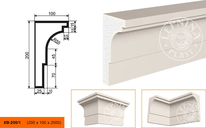 Карниз КВ-200/1 производителя LEPNINAPLAST изготовленный из полистирола высокой плотности, который покрыт эластичной шпатлевкой PS Technoplaster, покрытие абсолютно устойчиво к атмосферным и механическим повреждениям. Карниз является декоративным элементом, используемым монтажа под кровлю или межэтажным разделением. Он обладает рядом преимуществ, таких как легкий вес, прочность, устойчивость к влаге. Их установка также относительно проста. Карниз может использоваться как в новом строительстве, так и при реставрации старых зданий для придания им нового внешнего вида. Перед покраской не требуется обязательная покрытие грунтовкой, для склеивания изделий между собой рекомендуется использовать клея: CERESIT CT 84, PENOSIL FIXGo, TYTAN STYRO 753.