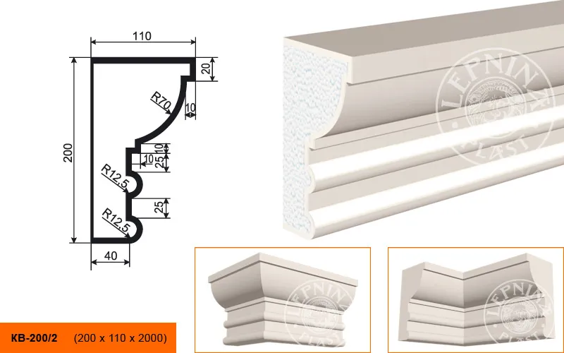 Карниз КВ-200/2 производителя LEPNINAPLAST изготовленный из полистирола высокой плотности, который покрыт эластичной шпатлевкой PS Technoplaster, покрытие абсолютно устойчиво к атмосферным и механическим повреждениям. Карниз является декоративным элементом, используемым монтажа под кровлю или межэтажным разделением. Он обладает рядом преимуществ, таких как легкий вес, прочность, устойчивость к влаге. Их установка также относительно проста. Карниз может использоваться как в новом строительстве, так и при реставрации старых зданий для придания им нового внешнего вида. Перед покраской не требуется обязательная покрытие грунтовкой, для склеивания изделий между собой рекомендуется использовать клея: CERESIT CT 84, PENOSIL FIXGo, TYTAN STYRO 753.