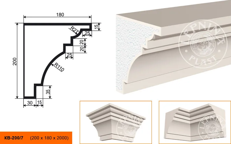 Карниз КВ-200/7 производителя LEPNINAPLAST изготовленный из полистирола высокой плотности, который покрыт эластичной шпатлевкой PS Technoplaster, покрытие абсолютно устойчиво к атмосферным и механическим повреждениям. Карниз является декоративным элементом, используемым монтажа под кровлю или межэтажным разделением. Он обладает рядом преимуществ, таких как легкий вес, прочность, устойчивость к влаге. Их установка также относительно проста. Карниз может использоваться как в новом строительстве, так и при реставрации старых зданий для придания им нового внешнего вида. Перед покраской не требуется обязательная покрытие грунтовкой, для склеивания изделий между собой рекомендуется использовать клея: CERESIT CT 84, PENOSIL FIXGo, TYTAN STYRO 753.