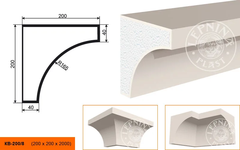 Карниз КВ-200/8 производителя LEPNINAPLAST изготовленный из полистирола высокой плотности, который покрыт эластичной шпатлевкой PS Technoplaster, покрытие абсолютно устойчиво к атмосферным и механическим повреждениям. Карниз является декоративным элементом, используемым монтажа под кровлю или межэтажным разделением. Он обладает рядом преимуществ, таких как легкий вес, прочность, устойчивость к влаге. Их установка также относительно проста. Карниз может использоваться как в новом строительстве, так и при реставрации старых зданий для придания им нового внешнего вида. Перед покраской не требуется обязательная покрытие грунтовкой, для склеивания изделий между собой рекомендуется использовать клея: CERESIT CT 84, PENOSIL FIXGo, TYTAN STYRO 753.