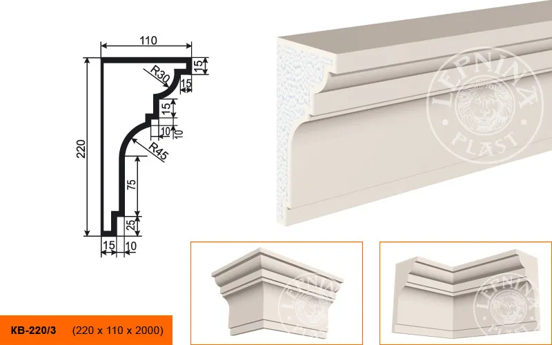 Карниз КВ-220/3 производителя LEPNINAPLAST изготовленный из полистирола высокой плотности, который покрыт эластичной шпатлевкой PS Technoplaster, покрытие абсолютно устойчиво к атмосферным и механическим повреждениям. Карниз является декоративным элементом, используемым монтажа под кровлю или межэтажным разделением. Он обладает рядом преимуществ, таких как легкий вес, прочность, устойчивость к влаге. Их установка также относительно проста. Карниз может использоваться как в новом строительстве, так и при реставрации старых зданий для придания им нового внешнего вида. Перед покраской не требуется обязательная покрытие грунтовкой, для склеивания изделий между собой рекомендуется использовать клея: CERESIT CT 84, PENOSIL FIXGo, TYTAN STYRO 753.