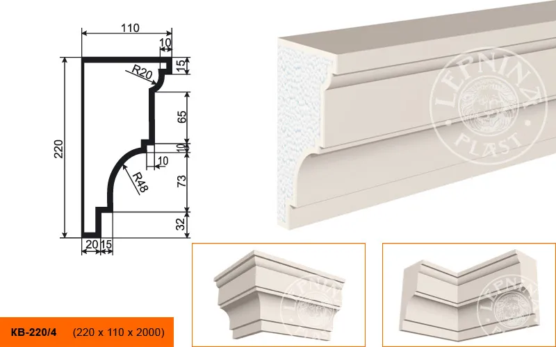 Карниз КВ-220/4 производителя LEPNINAPLAST изготовленный из полистирола высокой плотности, который покрыт эластичной шпатлевкой PS Technoplaster, покрытие абсолютно устойчиво к атмосферным и механическим повреждениям. Карниз является декоративным элементом, используемым монтажа под кровлю или межэтажным разделением. Он обладает рядом преимуществ, таких как легкий вес, прочность, устойчивость к влаге. Их установка также относительно проста. Карниз может использоваться как в новом строительстве, так и при реставрации старых зданий для придания им нового внешнего вида. Перед покраской не требуется обязательная покрытие грунтовкой, для склеивания изделий между собой рекомендуется использовать клея: CERESIT CT 84, PENOSIL FIXGo, TYTAN STYRO 753.