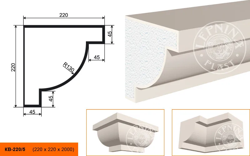 Карниз КВ-220/5 производителя LEPNINAPLAST изготовленный из полистирола высокой плотности, который покрыт эластичной шпатлевкой PS Technoplaster, покрытие абсолютно устойчиво к атмосферным и механическим повреждениям. Карниз является декоративным элементом, используемым монтажа под кровлю или межэтажным разделением. Он обладает рядом преимуществ, таких как легкий вес, прочность, устойчивость к влаге. Их установка также относительно проста. Карниз может использоваться как в новом строительстве, так и при реставрации старых зданий для придания им нового внешнего вида. Перед покраской не требуется обязательная покрытие грунтовкой, для склеивания изделий между собой рекомендуется использовать клея: CERESIT CT 84, PENOSIL FIXGo, TYTAN STYRO 753.