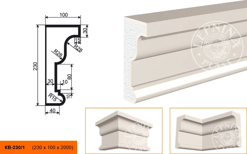 Карниз КВ-230/1 производителя LEPNINAPLAST изготовленный из полистирола высокой плотности, который покрыт эластичной шпатлевкой PS Technoplaster, покрытие абсолютно устойчиво к атмосферным и механическим повреждениям. Карниз является декоративным элементом, используемым монтажа под кровлю или межэтажным разделением. Он обладает рядом преимуществ, таких как легкий вес, прочность, устойчивость к влаге. Их установка также относительно проста. Карниз может использоваться как в новом строительстве, так и при реставрации старых зданий для придания им нового внешнего вида. Перед покраской не требуется обязательная покрытие грунтовкой, для склеивания изделий между собой рекомендуется использовать клея: CERESIT CT 84, PENOSIL FIXGo, TYTAN STYRO 753.