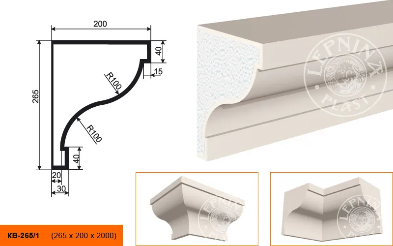 Карниз КВ-265/1 производителя LEPNINAPLAST изготовленный из полистирола высокой плотности, который покрыт эластичной шпатлевкой PS Technoplaster, покрытие абсолютно устойчиво к атмосферным и механическим повреждениям. Карниз является декоративным элементом, используемым монтажа под кровлю или межэтажным разделением. Он обладает рядом преимуществ, таких как легкий вес, прочность, устойчивость к влаге. Их установка также относительно проста. Карниз может использоваться как в новом строительстве, так и при реставрации старых зданий для придания им нового внешнего вида. Перед покраской не требуется обязательная покрытие грунтовкой, для склеивания изделий между собой рекомендуется использовать клея: CERESIT CT 84, PENOSIL FIXGo, TYTAN STYRO 753.