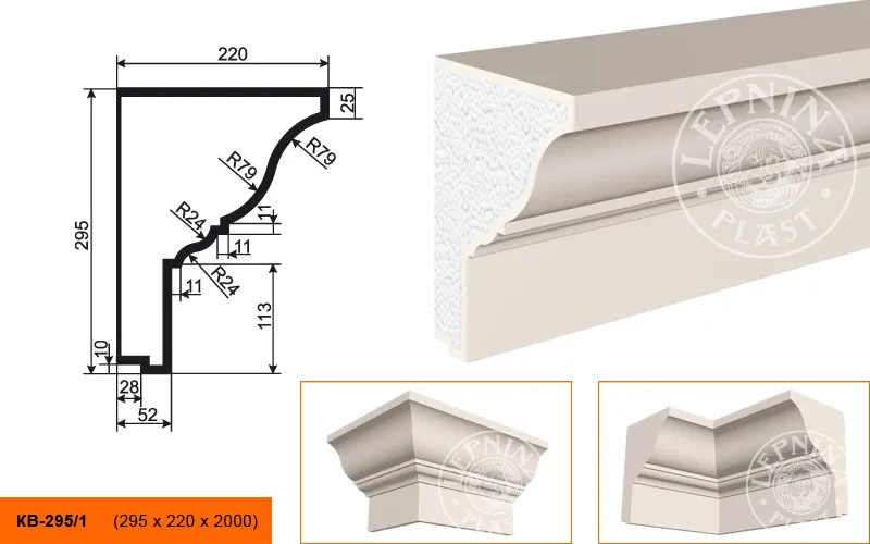 Карниз КВ-295/1 производителя LEPNINAPLAST изготовленный из полистирола высокой плотности, который покрыт эластичной шпатлевкой PS Technoplaster, покрытие абсолютно устойчиво к атмосферным и механическим повреждениям. Карниз является декоративным элементом, используемым монтажа под кровлю или межэтажным разделением. Он обладает рядом преимуществ, таких как легкий вес, прочность, устойчивость к влаге. Их установка также относительно проста. Карниз может использоваться как в новом строительстве, так и при реставрации старых зданий для придания им нового внешнего вида. Перед покраской не требуется обязательная покрытие грунтовкой, для склеивания изделий между собой рекомендуется использовать клея: CERESIT CT 84, PENOSIL FIXGo, TYTAN STYRO 753.