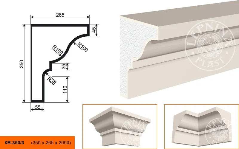 Карниз КВ-350/3 производителя LEPNINAPLAST изготовленный из полистирола высокой плотности, который покрыт эластичной шпатлевкой PS Technoplaster, покрытие абсолютно устойчиво к атмосферным и механическим повреждениям. Карниз является декоративным элементом, используемым монтажа под кровлю или межэтажным разделением. Он обладает рядом преимуществ, таких как легкий вес, прочность, устойчивость к влаге. Их установка также относительно проста. Карниз может использоваться как в новом строительстве, так и при реставрации старых зданий для придания им нового внешнего вида. Перед покраской не требуется обязательная покрытие грунтовкой, для склеивания изделий между собой рекомендуется использовать клея: CERESIT CT 84, PENOSIL FIXGo, TYTAN STYRO 753.