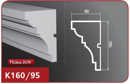 Карниз для фасада модели К160/95 изготовлен из пенопласта (пенополистирол), верхний слой которого представляет собой эластичное покрытие на основе акриловых полимеров, а армирующее покрытие выполнено из кварцевого песка. Это изделие предназначено для покраски и идеально подходит для отделки наружных поверхностей. Особенности изделий из пенопласта включают в себя высокую прочность, влагостойкость, легкий вес и возможность монтажа на утепленных стенах. Пенопластовые карнизы легко обрабатывать и хорошо переносят различные температурные воздействия, что делает их долговечными и очень надежными. Также возможно изготовление карнизов по индивидуальным размерам.
