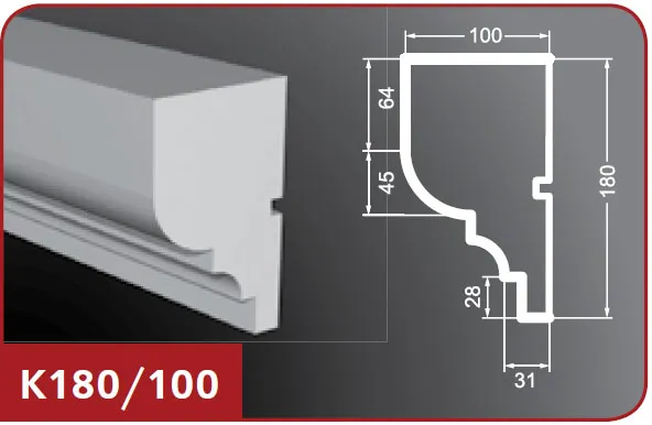 Карниз для фасада модели К180/100 изготовлен из пенопласта (пенополистирол), верхний слой которого представляет собой эластичное покрытие на основе акриловых полимеров, а армирующее покрытие выполнено из кварцевого песка. Это изделие предназначено для покраски и идеально подходит для отделки наружных поверхностей. Особенности изделий из пенопласта включают в себя высокую прочность, влагостойкость, легкий вес и возможность монтажа на утепленных стенах. Пенопластовые карнизы легко обрабатывать и хорошо переносят различные температурные воздействия, что делает их долговечными и очень надежными. Также возможно изготовление карнизов по индивидуальным размерам.