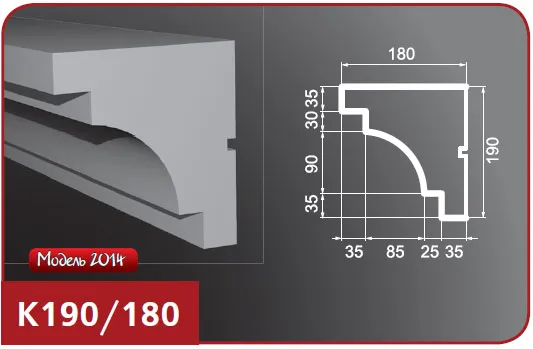 Карниз для фасада модели К190/180 изготовлен из пенопласта (пенополистирол), верхний слой которого представляет собой эластичное покрытие на основе акриловых полимеров, а армирующее покрытие выполнено из кварцевого песка. Это изделие предназначено для покраски и идеально подходит для отделки наружных поверхностей. Особенности изделий из пенопласта включают в себя высокую прочность, влагостойкость, легкий вес и возможность монтажа на утепленных стенах. Пенопластовые карнизы легко обрабатывать и хорошо переносят различные температурные воздействия, что делает их долговечными и очень надежными. Также возможно изготовление карнизов по индивидуальным размерам.
