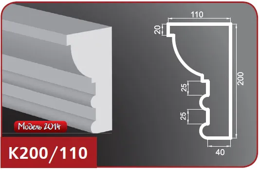 Карниз для фасада модели К200/110 изготовлен из пенопласта (пенополистирол), верхний слой которого представляет собой эластичное покрытие на основе акриловых полимеров, а армирующее покрытие выполнено из кварцевого песка. Это изделие предназначено для покраски и идеально подходит для отделки наружных поверхностей. Особенности изделий из пенопласта включают в себя высокую прочность, влагостойкость, легкий вес и возможность монтажа на утепленных стенах. Пенопластовые карнизы легко обрабатывать и хорошо переносят различные температурные воздействия, что делает их долговечными и очень надежными. Также возможно изготовление карнизов по индивидуальным размерам.