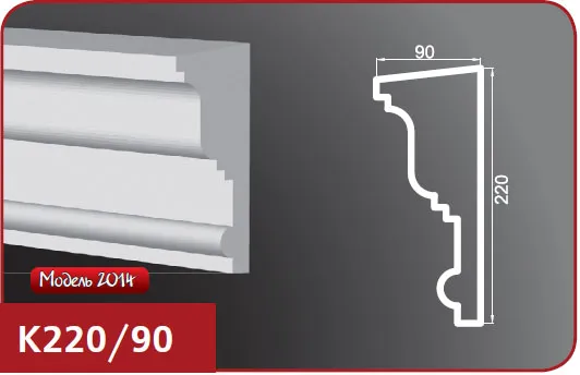 Карниз для фасада модели К220/90 изготовлен из пенопласта (пенополистирол), верхний слой которого представляет собой эластичное покрытие на основе акриловых полимеров, а армирующее покрытие выполнено из кварцевого песка. Это изделие предназначено для покраски и идеально подходит для отделки наружных поверхностей. Особенности изделий из пенопласта включают в себя высокую прочность, влагостойкость, легкий вес и возможность монтажа на утепленных стенах. Пенопластовые карнизы легко обрабатывать и хорошо переносят различные температурные воздействия, что делает их долговечными и очень надежными. Также возможно изготовление карнизов по индивидуальным размерам.
