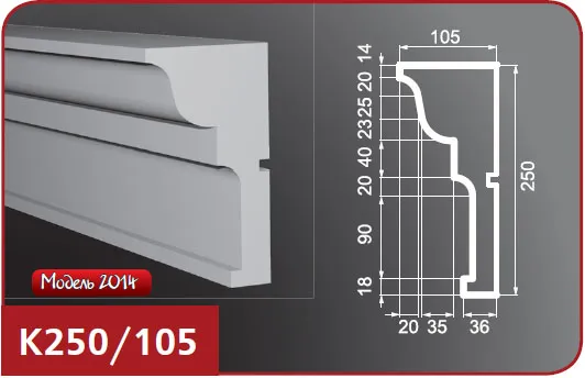 Карниз для фасада модели К250/105 изготовлен из пенопласта (пенополистирол), верхний слой которого представляет собой эластичное покрытие на основе акриловых полимеров, а армирующее покрытие выполнено из кварцевого песка. Это изделие предназначено для покраски и идеально подходит для отделки наружных поверхностей. Особенности изделий из пенопласта включают в себя высокую прочность, влагостойкость, легкий вес и возможность монтажа на утепленных стенах. Пенопластовые карнизы легко обрабатывать и хорошо переносят различные температурные воздействия, что делает их долговечными и очень надежными. Также возможно изготовление карнизов по индивидуальным размерам.