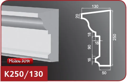 Карниз для фасада модели К250/130 изготовлен из пенопласта (пенополистирол), верхний слой которого представляет собой эластичное покрытие на основе акриловых полимеров, а армирующее покрытие выполнено из кварцевого песка. Это изделие предназначено для покраски и идеально подходит для отделки наружных поверхностей. Особенности изделий из пенопласта включают в себя высокую прочность, влагостойкость, легкий вес и возможность монтажа на утепленных стенах. Пенопластовые карнизы легко обрабатывать и хорошо переносят различные температурные воздействия, что делает их долговечными и очень надежными. Также возможно изготовление карнизов по индивидуальным размерам.