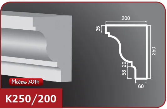 Карниз для фасада модели К250/200 изготовлен из пенопласта (пенополистирол), верхний слой которого представляет собой эластичное покрытие на основе акриловых полимеров, а армирующее покрытие выполнено из кварцевого песка. Это изделие предназначено для покраски и идеально подходит для отделки наружных поверхностей. Особенности изделий из пенопласта включают в себя высокую прочность, влагостойкость, легкий вес и возможность монтажа на утепленных стенах. Пенопластовые карнизы легко обрабатывать и хорошо переносят различные температурные воздействия, что делает их долговечными и очень надежными. Также возможно изготовление карнизов по индивидуальным размерам.