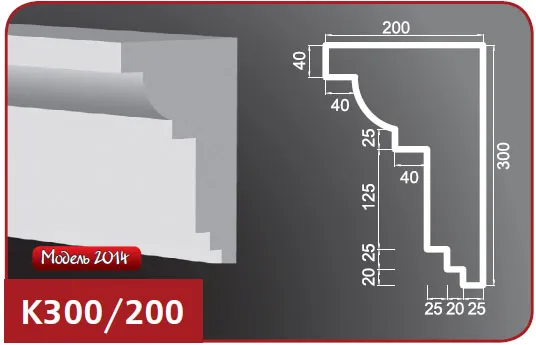 Карниз для фасада модели К300/200 изготовлен из пенопласта (пенополистирол), верхний слой которого представляет собой эластичное покрытие на основе акриловых полимеров, а армирующее покрытие выполнено из кварцевого песка. Это изделие предназначено для покраски и идеально подходит для отделки наружных поверхностей. Особенности изделий из пенопласта включают в себя высокую прочность, влагостойкость, легкий вес и возможность монтажа на утепленных стенах. Пенопластовые карнизы легко обрабатывать и хорошо переносят различные температурные воздействия, что делает их долговечными и очень надежными. Также возможно изготовление карнизов по индивидуальным размерам.