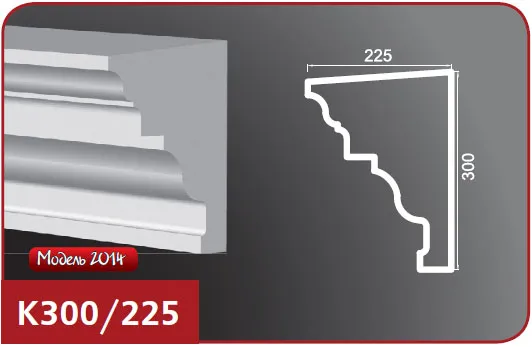Карниз для фасада модели К300/225 изготовлен из пенопласта (пенополистирол), верхний слой которого представляет собой эластичное покрытие на основе акриловых полимеров, а армирующее покрытие выполнено из кварцевого песка. Это изделие предназначено для покраски и идеально подходит для отделки наружных поверхностей. Особенности изделий из пенопласта включают в себя высокую прочность, влагостойкость, легкий вес и возможность монтажа на утепленных стенах. Пенопластовые карнизы легко обрабатывать и хорошо переносят различные температурные воздействия, что делает их долговечными и очень надежными. Также возможно изготовление карнизов по индивидуальным размерам.