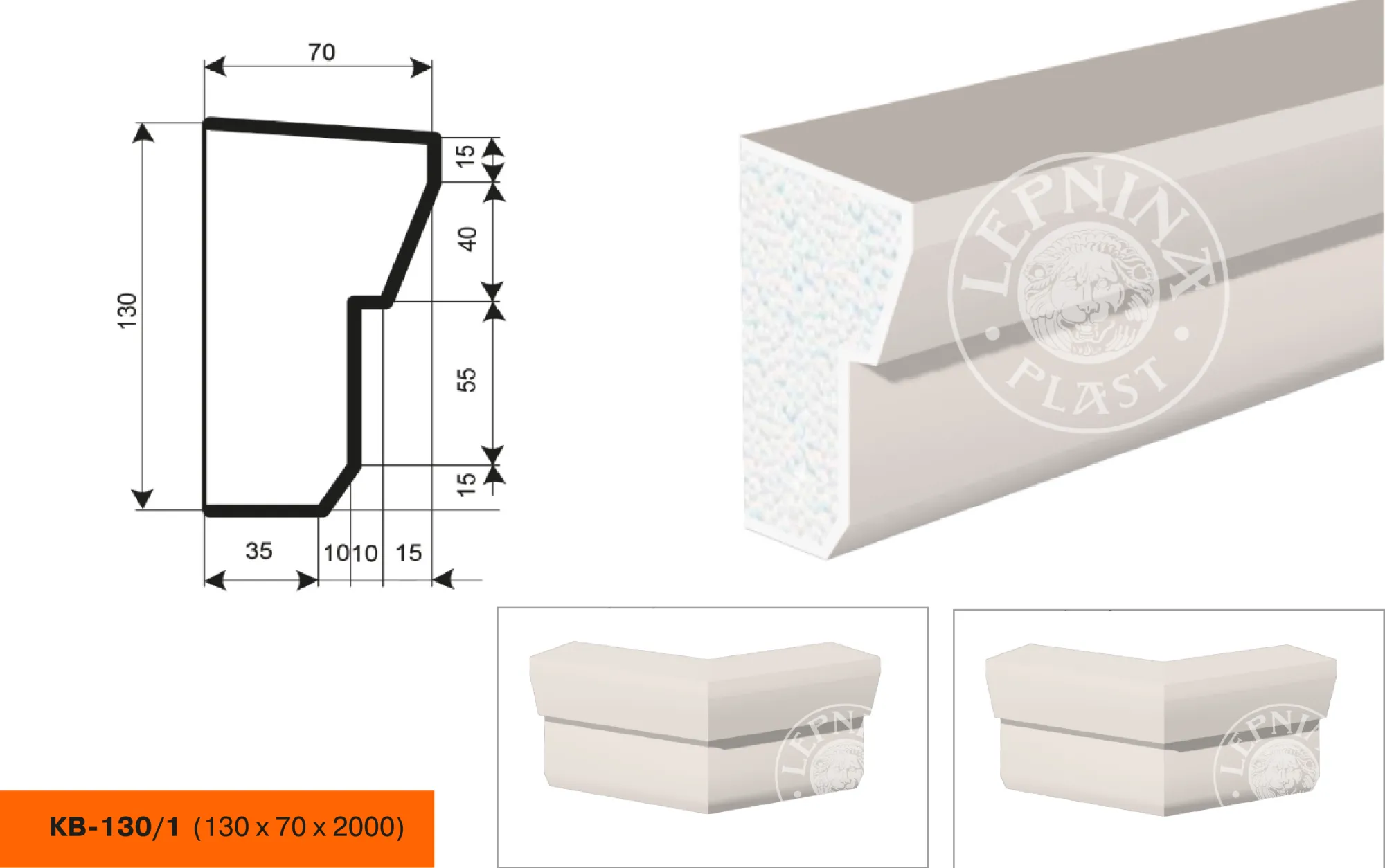 Карниз КВ-130-1 производителя LEPNINAPLAST изготовленный из полистирола высокой плотности, который покрыт эластичной шпатлевкой PS Technoplaster, покрытие абсолютно устойчиво к атмосферным и механическим повреждениям. Карниз является декоративным элементом, используемым монтажа под кровлю или межэтажным разделением. Он обладает рядом преимуществ, таких как легкий вес, прочность, устойчивость к влаге. Их установка также относительно проста. Карниз может использоваться как в новом строительстве, так и при реставрации старых зданий для придания им нового внешнего вида. Перед покраской не требуется обязательная покрытие грунтовкой, для склеивания изделий между собой рекомендуется использовать клея: CERESIT CT 84, PENOSIL FIXGo, TYTAN STYRO 753.