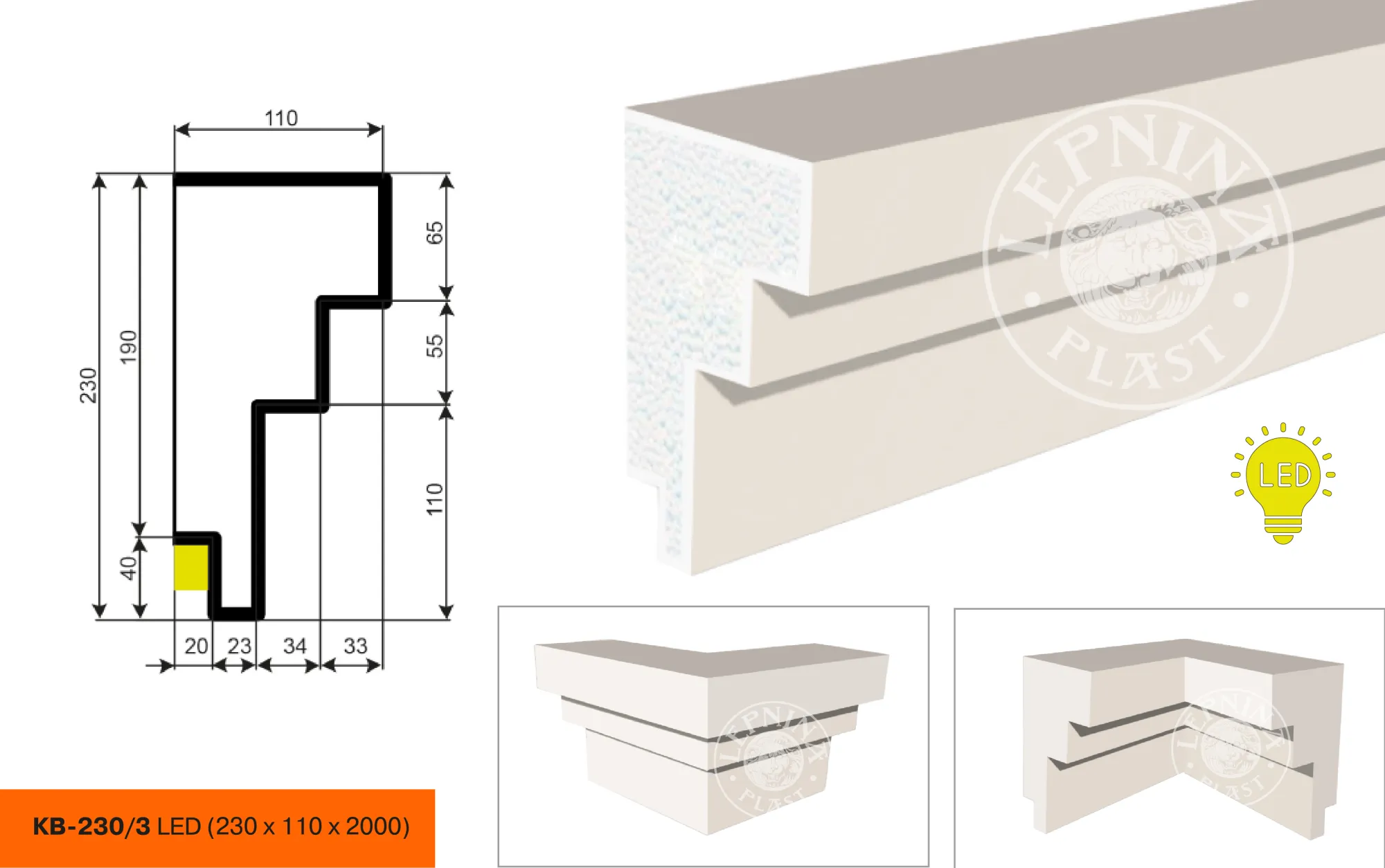 Карниз со скрытым освещением КВ-230/3 LED для фасадов-не только подчеркивает архитектурные особенности здания, но и создает эффектную подсветку, что делает фасад более привлекательным в вечернее время! Изделия изготавливается из прочного полистирола высокой плотности и покрыт эластичной шпатлевкой PS Technoplaster, что обеспечивает его надежность и защиту от атмосферных и механических повреждений. Этот карниз является стильным декоративным элементом, который можно установить под кровлей или на границах этажей.
