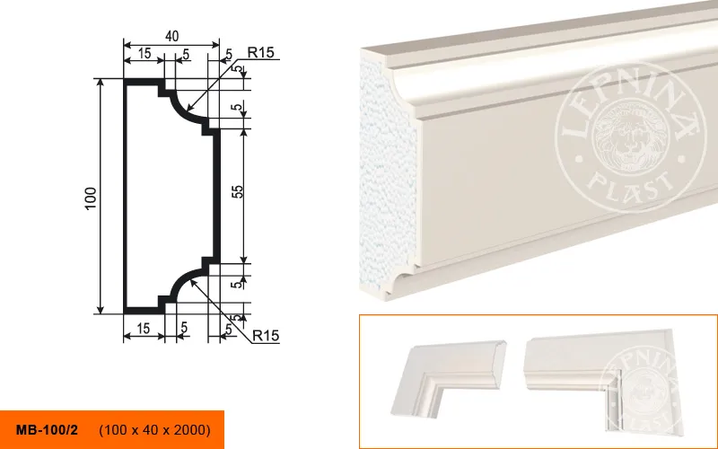Молдинг МВ-100/2 производителя LEPNINAPLAST изготовленный из полистирола высокой плотности, который покрыт эластичной шпатлевкой PS Technoplaster, покрытие абсолютно устойчиво к атмосферным и механическим повреждениям. Молдинг используют для обрамления окон, межэтажного разделения, может использоваться как в новом строительстве, так и при реставрации старых зданий для придания им нового внешнего вида. Профиль обладает рядом преимуществ, таких как легкий вес, прочность, устойчивость к влаге. Установка молдинга производится в соответствии с инструкциями производителя, что обеспечивает правильное и надежное крепление. Перед покраской не требуется обязательная покрытие грунтовкой, для склеивания изделий между собой рекомендуется использовать клея: CERESIT CT 84, PENOSIL FIXGo, TYTAN STYRO 753.