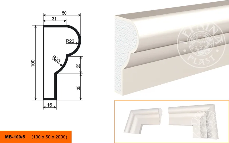 Молдинг МВ-100/5 производителя LEPNINAPLAST изготовленный из полистирола высокой плотности, который покрыт эластичной шпатлевкой PS Technoplaster, покрытие абсолютно устойчиво к атмосферным и механическим повреждениям. Молдинг используют для обрамления окон, межэтажного разделения, может использоваться как в новом строительстве, так и при реставрации старых зданий для придания им нового внешнего вида. Профиль обладает рядом преимуществ, таких как легкий вес, прочность, устойчивость к влаге. Установка молдинга производится в соответствии с инструкциями производителя, что обеспечивает правильное и надежное крепление. Перед покраской не требуется обязательная покрытие грунтовкой, для склеивания изделий между собой рекомендуется использовать клея: CERESIT CT 84, PENOSIL FIXGo, TYTAN STYRO 753.