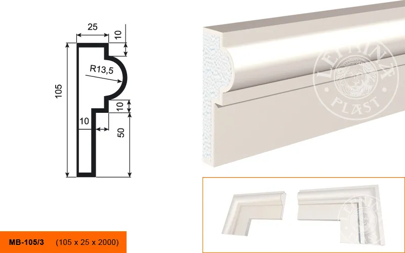 Молдинг МВ-105/3 производителя LEPNINAPLAST изготовленный из полистирола высокой плотности, который покрыт эластичной шпатлевкой PS Technoplaster, покрытие абсолютно устойчиво к атмосферным и механическим повреждениям. Молдинг используют для обрамления окон, межэтажного разделения, может использоваться как в новом строительстве, так и при реставрации старых зданий для придания им нового внешнего вида. Профиль обладает рядом преимуществ, таких как легкий вес, прочность, устойчивость к влаге. Установка молдинга производится в соответствии с инструкциями производителя, что обеспечивает правильное и надежное крепление. Перед покраской не требуется обязательная покрытие грунтовкой, для склеивания изделий между собой рекомендуется использовать клея: CERESIT CT 84, PENOSIL FIXGo, TYTAN STYRO 753.