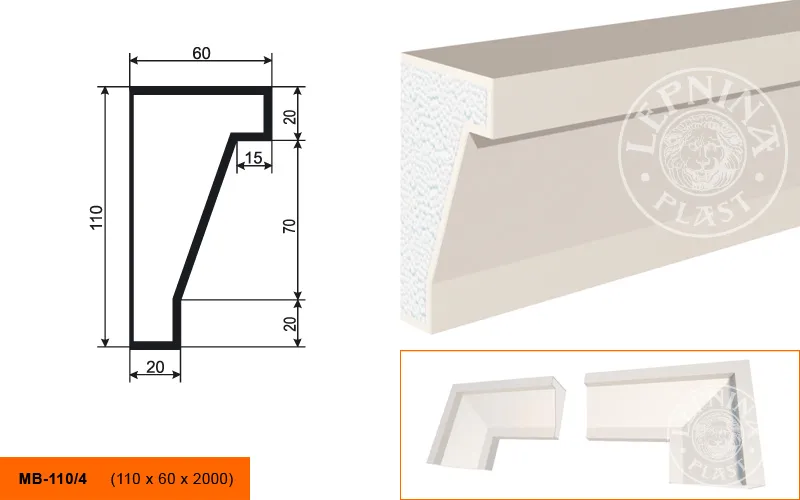 Молдинг МВ-110/4 производителя LEPNINAPLAST изготовленный из полистирола высокой плотности, который покрыт эластичной шпатлевкой PS Technoplaster, покрытие абсолютно устойчиво к атмосферным и механическим повреждениям. Молдинг используют для обрамления окон, межэтажного разделения, может использоваться как в новом строительстве, так и при реставрации старых зданий для придания им нового внешнего вида. Профиль обладает рядом преимуществ, таких как легкий вес, прочность, устойчивость к влаге. Установка молдинга производится в соответствии с инструкциями производителя, что обеспечивает правильное и надежное крепление. Перед покраской не требуется обязательная покрытие грунтовкой, для склеивания изделий между собой рекомендуется использовать клея: CERESIT CT 84, PENOSIL FIXGo, TYTAN STYRO 753.