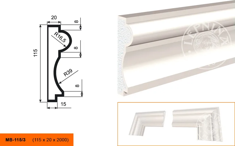 Молдинг МВ-115/3 производителя LEPNINAPLAST изготовленный из полистирола высокой плотности, который покрыт эластичной шпатлевкой PS Technoplaster, покрытие абсолютно устойчиво к атмосферным и механическим повреждениям. Молдинг используют для обрамления окон, межэтажного разделения, может использоваться как в новом строительстве, так и при реставрации старых зданий для придания им нового внешнего вида. Профиль обладает рядом преимуществ, таких как легкий вес, прочность, устойчивость к влаге. Установка молдинга производится в соответствии с инструкциями производителя, что обеспечивает правильное и надежное крепление. Перед покраской не требуется обязательная покрытие грунтовкой, для склеивания изделий между собой рекомендуется использовать клея: CERESIT CT 84, PENOSIL FIXGo, TYTAN STYRO 753.