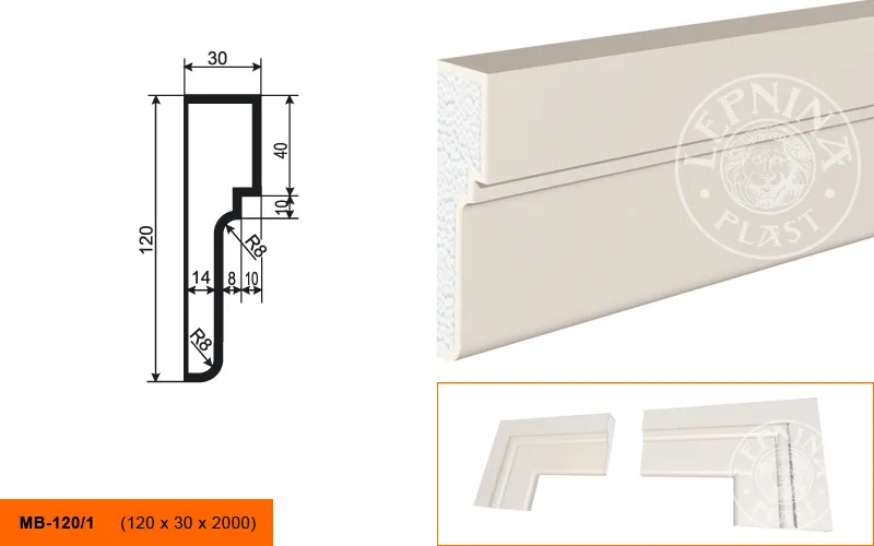 Молдинг МВ-120/1 производителя LEPNINAPLAST изготовленный из полистирола высокой плотности, который покрыт эластичной шпатлевкой PS Technoplaster, покрытие абсолютно устойчиво к атмосферным и механическим повреждениям. Молдинг используют для обрамления окон, межэтажного разделения, может использоваться как в новом строительстве, так и при реставрации старых зданий для придания им нового внешнего вида. Профиль обладает рядом преимуществ, таких как легкий вес, прочность, устойчивость к влаге. Установка молдинга производится в соответствии с инструкциями производителя, что обеспечивает правильное и надежное крепление. Перед покраской не требуется обязательная покрытие грунтовкой, для склеивания изделий между собой рекомендуется использовать клея: CERESIT CT 84, PENOSIL FIXGo, TYTAN STYRO 753.