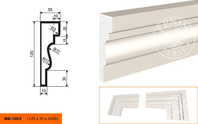 Молдинг МВ-120/2 производителя LEPNINAPLAST изготовленный из полистирола высокой плотности, который покрыт эластичной шпатлевкой PS Technoplaster, покрытие абсолютно устойчиво к атмосферным и механическим повреждениям. Молдинг используют для обрамления окон, межэтажного разделения, может использоваться как в новом строительстве, так и при реставрации старых зданий для придания им нового внешнего вида. Профиль обладает рядом преимуществ, таких как легкий вес, прочность, устойчивость к влаге. Установка молдинга производится в соответствии с инструкциями производителя, что обеспечивает правильное и надежное крепление. Перед покраской не требуется обязательная покрытие грунтовкой, для склеивания изделий между собой рекомендуется использовать клея: CERESIT CT 84, PENOSIL FIXGo, TYTAN STYRO 753.