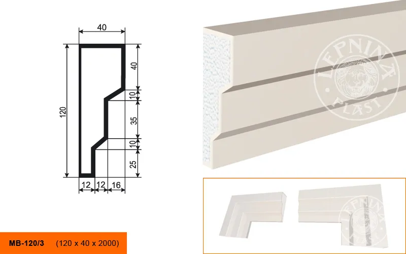 Молдинг МВ-120/3 производителя LEPNINAPLAST изготовленный из полистирола высокой плотности, который покрыт эластичной шпатлевкой PS Technoplaster, покрытие абсолютно устойчиво к атмосферным и механическим повреждениям. Молдинг используют для обрамления окон, межэтажного разделения, может использоваться как в новом строительстве, так и при реставрации старых зданий для придания им нового внешнего вида. Профиль обладает рядом преимуществ, таких как легкий вес, прочность, устойчивость к влаге. Установка молдинга производится в соответствии с инструкциями производителя, что обеспечивает правильное и надежное крепление. Перед покраской не требуется обязательная покрытие грунтовкой, для склеивания изделий между собой рекомендуется использовать клея: CERESIT CT 84, PENOSIL FIXGo, TYTAN STYRO 753.