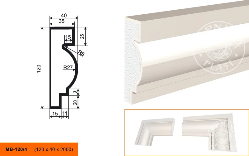 Молдинг МВ-120/4 производителя LEPNINAPLAST изготовленный из полистирола высокой плотности, который покрыт эластичной шпатлевкой PS Technoplaster, покрытие абсолютно устойчиво к атмосферным и механическим повреждениям. Молдинг используют для обрамления окон, межэтажного разделения, может использоваться как в новом строительстве, так и при реставрации старых зданий для придания им нового внешнего вида. Профиль обладает рядом преимуществ, таких как легкий вес, прочность, устойчивость к влаге. Установка молдинга производится в соответствии с инструкциями производителя, что обеспечивает правильное и надежное крепление. Перед покраской не требуется обязательная покрытие грунтовкой, для склеивания изделий между собой рекомендуется использовать клея: CERESIT CT 84, PENOSIL FIXGo, TYTAN STYRO 753.