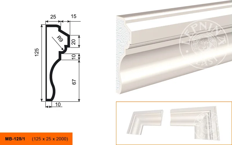 Молдинг МВ-125/1 производителя LEPNINAPLAST изготовленный из полистирола высокой плотности, который покрыт эластичной шпатлевкой PS Technoplaster, покрытие абсолютно устойчиво к атмосферным и механическим повреждениям. Молдинг используют для обрамления окон, межэтажного разделения, может использоваться как в новом строительстве, так и при реставрации старых зданий для придания им нового внешнего вида. Профиль обладает рядом преимуществ, таких как легкий вес, прочность, устойчивость к влаге. Установка молдинга производится в соответствии с инструкциями производителя, что обеспечивает правильное и надежное крепление. Перед покраской не требуется обязательная покрытие грунтовкой, для склеивания изделий между собой рекомендуется использовать клея: CERESIT CT 84, PENOSIL FIXGo, TYTAN STYRO 753.