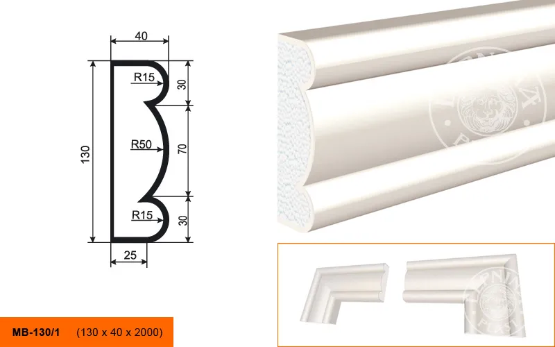Молдинг МВ-130/1 производителя LEPNINAPLAST изготовленный из полистирола высокой плотности, который покрыт эластичной шпатлевкой PS Technoplaster, покрытие абсолютно устойчиво к атмосферным и механическим повреждениям. Молдинг используют для обрамления окон, межэтажного разделения, может использоваться как в новом строительстве, так и при реставрации старых зданий для придания им нового внешнего вида. Профиль обладает рядом преимуществ, таких как легкий вес, прочность, устойчивость к влаге. Установка молдинга производится в соответствии с инструкциями производителя, что обеспечивает правильное и надежное крепление. Перед покраской не требуется обязательная покрытие грунтовкой, для склеивания изделий между собой рекомендуется использовать клея: CERESIT CT 84, PENOSIL FIXGo, TYTAN STYRO 753.