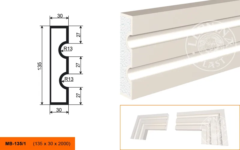 Молдинг МВ-135/1 производителя LEPNINAPLAST изготовленный из полистирола высокой плотности, который покрыт эластичной шпатлевкой PS Technoplaster, покрытие абсолютно устойчиво к атмосферным и механическим повреждениям. Молдинг используют для обрамления окон, межэтажного разделения, может использоваться как в новом строительстве, так и при реставрации старых зданий для придания им нового внешнего вида. Профиль обладает рядом преимуществ, таких как легкий вес, прочность, устойчивость к влаге. Установка молдинга производится в соответствии с инструкциями производителя, что обеспечивает правильное и надежное крепление. Перед покраской не требуется обязательная покрытие грунтовкой, для склеивания изделий между собой рекомендуется использовать клея: CERESIT CT 84, PENOSIL FIXGo, TYTAN STYRO 753.