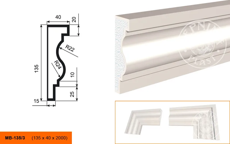 Молдинг МВ-135/3 производителя LEPNINAPLAST изготовленный из полистирола высокой плотности, который покрыт эластичной шпатлевкой PS Technoplaster, покрытие абсолютно устойчиво к атмосферным и механическим повреждениям. Молдинг используют для обрамления окон, межэтажного разделения, может использоваться как в новом строительстве, так и при реставрации старых зданий для придания им нового внешнего вида. Профиль обладает рядом преимуществ, таких как легкий вес, прочность, устойчивость к влаге. Установка молдинга производится в соответствии с инструкциями производителя, что обеспечивает правильное и надежное крепление. Перед покраской не требуется обязательная покрытие грунтовкой, для склеивания изделий между собой рекомендуется использовать клея: CERESIT CT 84, PENOSIL FIXGo, TYTAN STYRO 753.