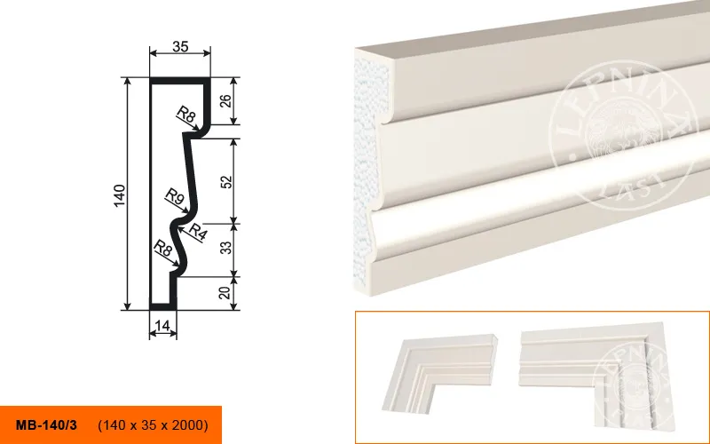 Молдинг МВ-140/3 производителя LEPNINAPLAST изготовленный из полистирола высокой плотности, который покрыт эластичной шпатлевкой PS Technoplaster, покрытие абсолютно устойчиво к атмосферным и механическим повреждениям. Молдинг используют для обрамления окон, межэтажного разделения, может использоваться как в новом строительстве, так и при реставрации старых зданий для придания им нового внешнего вида. Профиль обладает рядом преимуществ, таких как легкий вес, прочность, устойчивость к влаге. Установка молдинга производится в соответствии с инструкциями производителя, что обеспечивает правильное и надежное крепление. Перед покраской не требуется обязательная покрытие грунтовкой, для склеивания изделий между собой рекомендуется использовать клея: CERESIT CT 84, PENOSIL FIXGo, TYTAN STYRO 753.