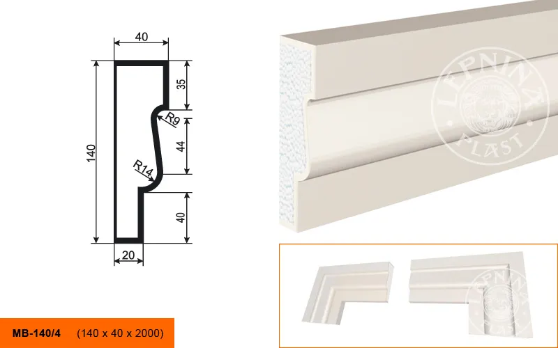 Молдинг МВ-140/4 производителя LEPNINAPLAST изготовленный из полистирола высокой плотности, который покрыт эластичной шпатлевкой PS Technoplaster, покрытие абсолютно устойчиво к атмосферным и механическим повреждениям. Молдинг используют для обрамления окон, межэтажного разделения, может использоваться как в новом строительстве, так и при реставрации старых зданий для придания им нового внешнего вида. Профиль обладает рядом преимуществ, таких как легкий вес, прочность, устойчивость к влаге. Установка молдинга производится в соответствии с инструкциями производителя, что обеспечивает правильное и надежное крепление. Перед покраской не требуется обязательная покрытие грунтовкой, для склеивания изделий между собой рекомендуется использовать клея: CERESIT CT 84, PENOSIL FIXGo, TYTAN STYRO 753.