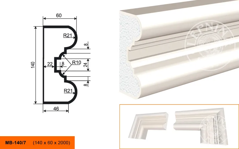 Молдинг МВ-140/7 производителя LEPNINAPLAST изготовленный из полистирола высокой плотности, который покрыт эластичной шпатлевкой PS Technoplaster, покрытие абсолютно устойчиво к атмосферным и механическим повреждениям. Молдинг используют для обрамления окон, межэтажного разделения, может использоваться как в новом строительстве, так и при реставрации старых зданий для придания им нового внешнего вида. Профиль обладает рядом преимуществ, таких как легкий вес, прочность, устойчивость к влаге. Установка молдинга производится в соответствии с инструкциями производителя, что обеспечивает правильное и надежное крепление. Перед покраской не требуется обязательная покрытие грунтовкой, для склеивания изделий между собой рекомендуется использовать клея: CERESIT CT 84, PENOSIL FIXGo, TYTAN STYRO 753.