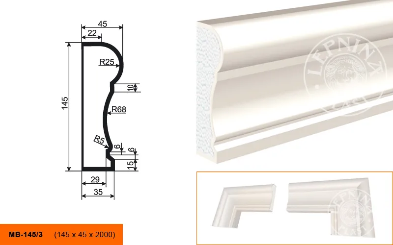 Молдинг МВ-145/3 производителя LEPNINAPLAST изготовленный из полистирола высокой плотности, который покрыт эластичной шпатлевкой PS Technoplaster, покрытие абсолютно устойчиво к атмосферным и механическим повреждениям. Молдинг используют для обрамления окон, межэтажного разделения, может использоваться как в новом строительстве, так и при реставрации старых зданий для придания им нового внешнего вида. Профиль обладает рядом преимуществ, таких как легкий вес, прочность, устойчивость к влаге. Установка молдинга производится в соответствии с инструкциями производителя, что обеспечивает правильное и надежное крепление. Перед покраской не требуется обязательная покрытие грунтовкой, для склеивания изделий между собой рекомендуется использовать клея: CERESIT CT 84, PENOSIL FIXGo, TYTAN STYRO 753.