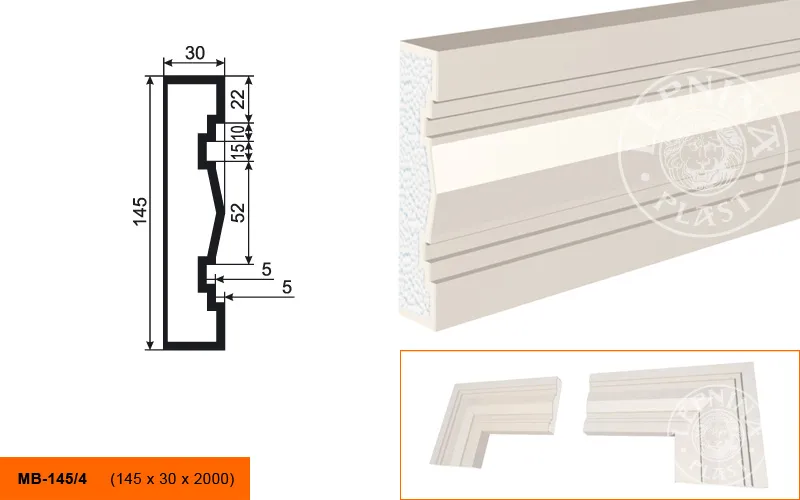 Молдинг МВ-145/4 производителя LEPNINAPLAST изготовленный из полистирола высокой плотности, который покрыт эластичной шпатлевкой PS Technoplaster, покрытие абсолютно устойчиво к атмосферным и механическим повреждениям. Молдинг используют для обрамления окон, межэтажного разделения, может использоваться как в новом строительстве, так и при реставрации старых зданий для придания им нового внешнего вида. Профиль обладает рядом преимуществ, таких как легкий вес, прочность, устойчивость к влаге. Установка молдинга производится в соответствии с инструкциями производителя, что обеспечивает правильное и надежное крепление. Перед покраской не требуется обязательная покрытие грунтовкой, для склеивания изделий между собой рекомендуется использовать клея: CERESIT CT 84, PENOSIL FIXGo, TYTAN STYRO 753.