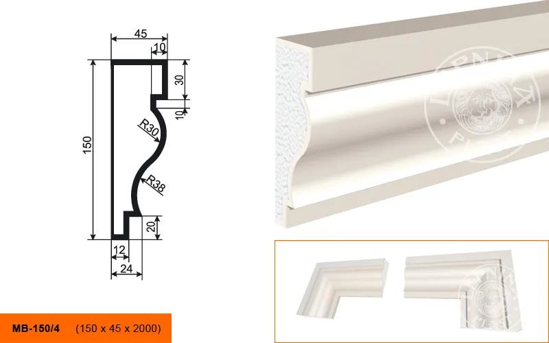 Молдинг МВ-150/4 производителя LEPNINAPLAST изготовленный из полистирола высокой плотности, который покрыт эластичной шпатлевкой PS Technoplaster, покрытие абсолютно устойчиво к атмосферным и механическим повреждениям. Молдинг используют для обрамления окон, межэтажного разделения, может использоваться как в новом строительстве, так и при реставрации старых зданий для придания им нового внешнего вида. Профиль обладает рядом преимуществ, таких как легкий вес, прочность, устойчивость к влаге. Установка молдинга производится в соответствии с инструкциями производителя, что обеспечивает правильное и надежное крепление. Перед покраской не требуется обязательная покрытие грунтовкой, для склеивания изделий между собой рекомендуется использовать клея: CERESIT CT 84, PENOSIL FIXGo, TYTAN STYRO 753.