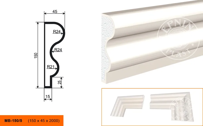 Молдинг МВ-150/5 производителя LEPNINAPLAST изготовленный из полистирола высокой плотности, который покрыт эластичной шпатлевкой PS Technoplaster, покрытие абсолютно устойчиво к атмосферным и механическим повреждениям. Молдинг используют для обрамления окон, межэтажного разделения, может использоваться как в новом строительстве, так и при реставрации старых зданий для придания им нового внешнего вида. Профиль обладает рядом преимуществ, таких как легкий вес, прочность, устойчивость к влаге. Установка молдинга производится в соответствии с инструкциями производителя, что обеспечивает правильное и надежное крепление. Перед покраской не требуется обязательная покрытие грунтовкой, для склеивания изделий между собой рекомендуется использовать клея: CERESIT CT 84, PENOSIL FIXGo, TYTAN STYRO 753.
